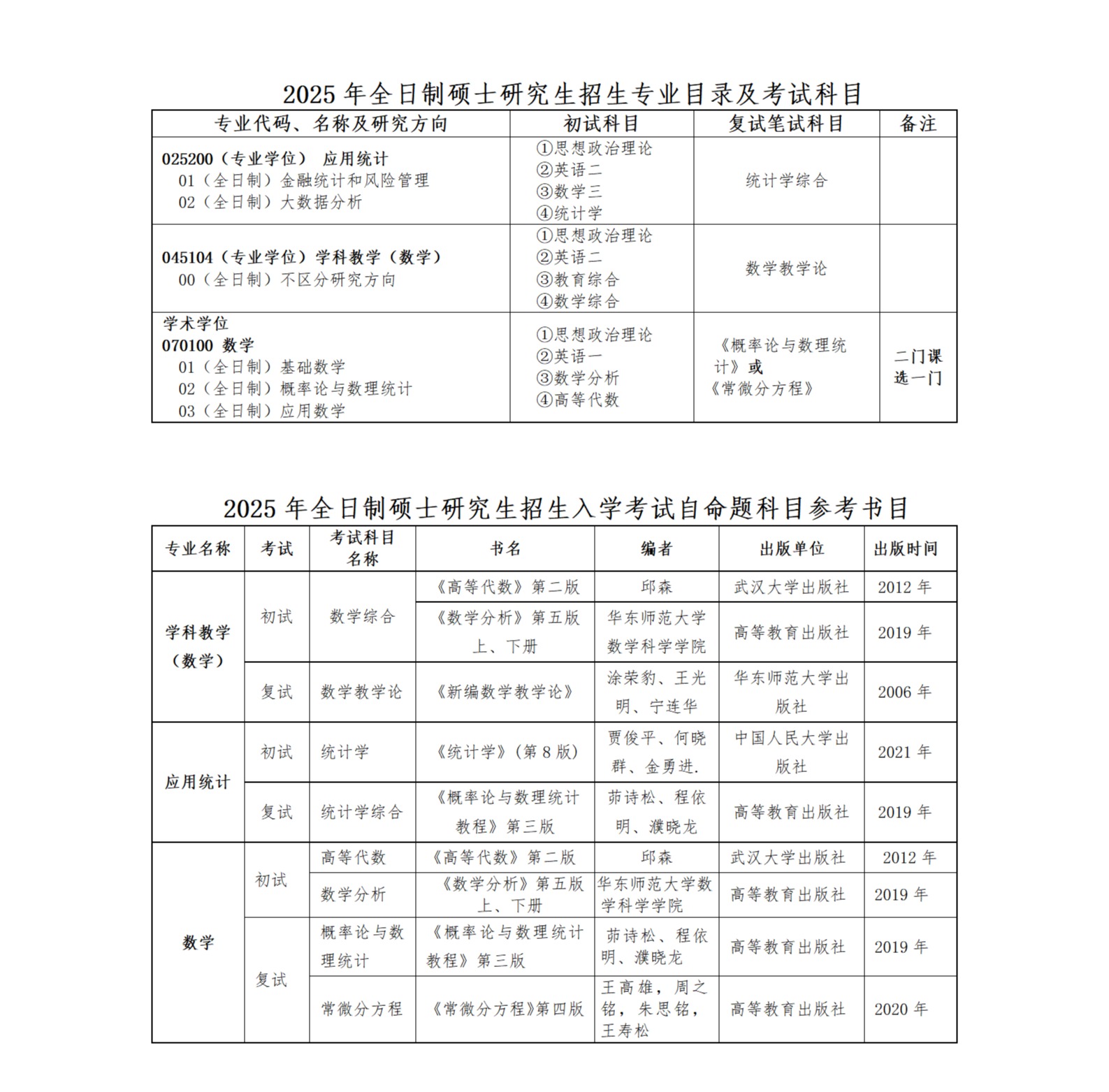 2006年获得“基础数学”二级学科硕士学位授予权,2011年获得数学一级学科硕士学位授予权,2018年获批教育硕士专业学位授权类别,2024年获批应用统计硕士专业学位授予权。目前在数学一级学科招收学术型硕士研究生,在学科教学(数学)领域和应用统计招收专业学位硕士研究生。具体学科方向如下: