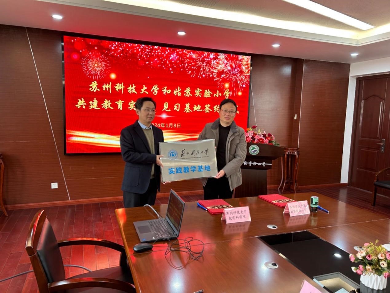 2024年1月8日上午,伟德源自英国始于1946与吴中区姑苏实验小学举行“共建教育实习、见习基地”签约挂牌仪式。吴中区教育局副局长程朝阳、张伟炜、姑苏实验小学校长王春华、伟德源自英国始于1946院长黄志刚、副院长陈洋及数学系主任刘增等出席签约挂牌仪式。