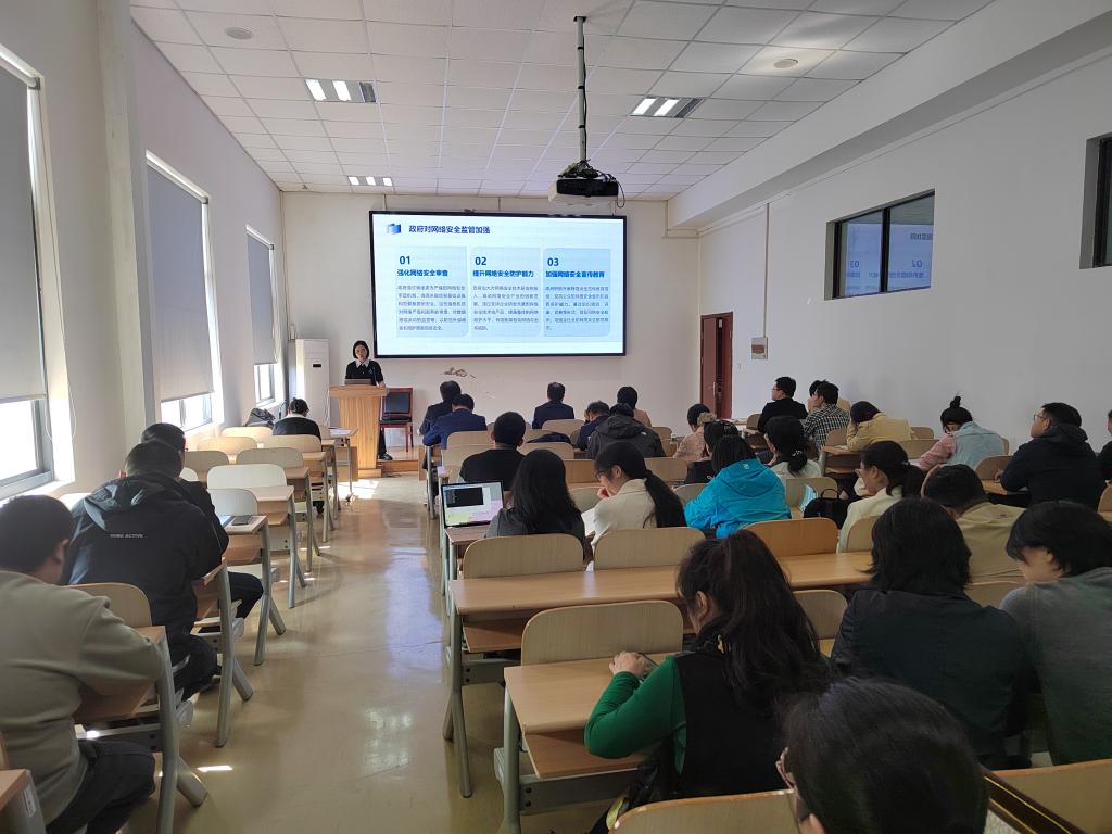 学院党委副书记兼副院长胡世怡以《网络安全法律法规——守护数字时代安全与合规》为题领学了网络安全方面的内容,从国内网络安全政策动态、网络安全法律法规框架和国家网络安全战略与政策等三方面阐述了维护网络安全的重要性。