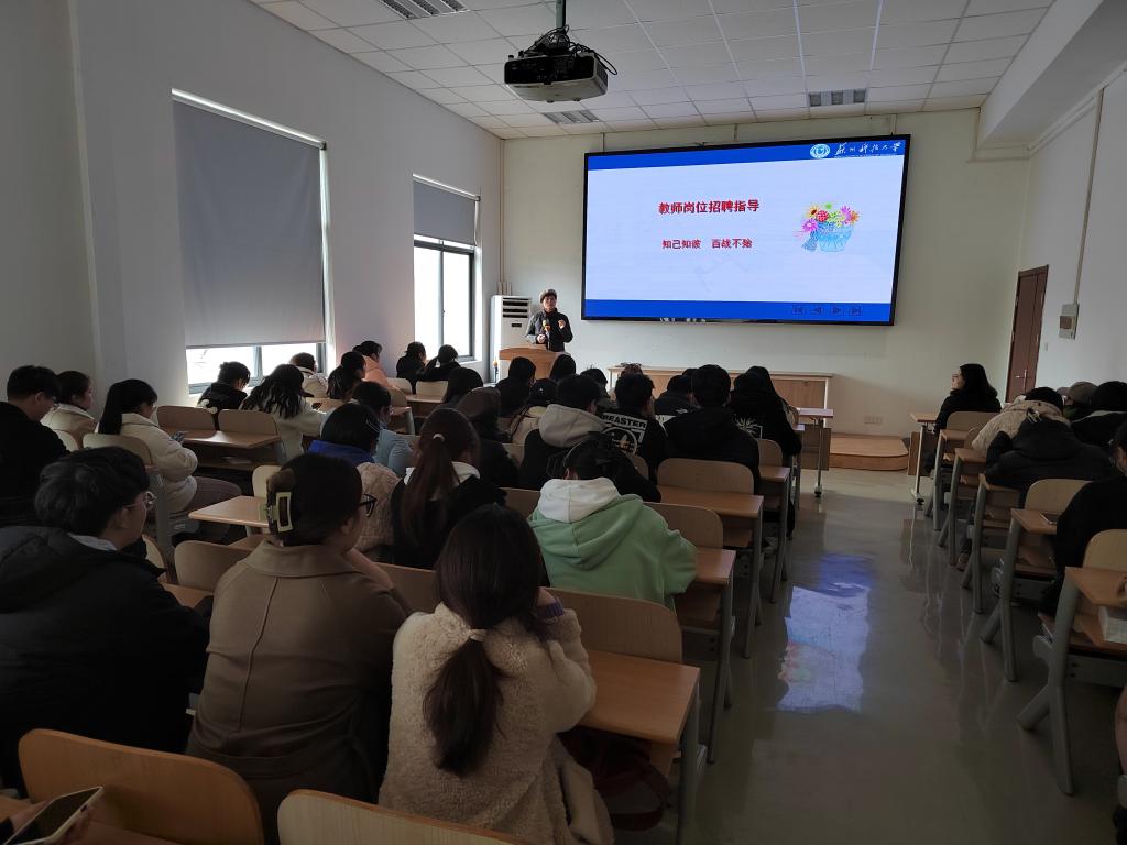 李玮玲从学生需求出发,对招聘流程、考核重点和注意事项三部分介绍了新区和园区教育局近年来校招情况,重点强调了师范生核心素养模拟授课环节的注意点,板书书写和呈现最佳方式,突出实战演练,提出要以饱满精神状态展示师范生职业素养。