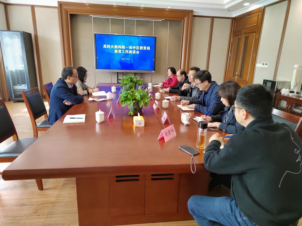 吴中区教师发展中心位于苏州国际教育园南区,中心主任刘伟介绍了近年来吴中区基础教育改革、规模、师资力量等方面情况,着重介绍了近五年我校毕业生在吴中相关学校的发展情况,同时对今年吴中区教师的招聘需求进行了说明。王开永简单介绍了学院学科建设、师资队伍、科研成果等方面情况,重点介绍了学院本科专业特色和2023届毕业生情况。双方就共建校地协同育人平台,以及在师资培训、师范生培养就业、社会服务等方面合作进行了广泛而深入地交流。