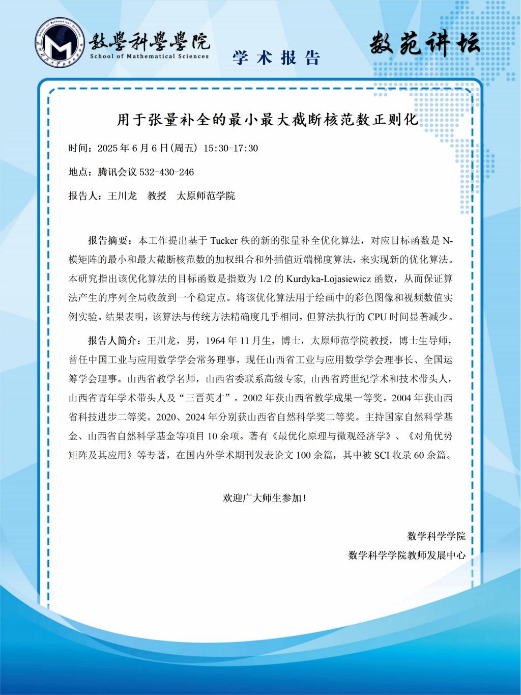【数苑讲坛】第十八讲:用于张量补全的最小最大截断核范数正则化