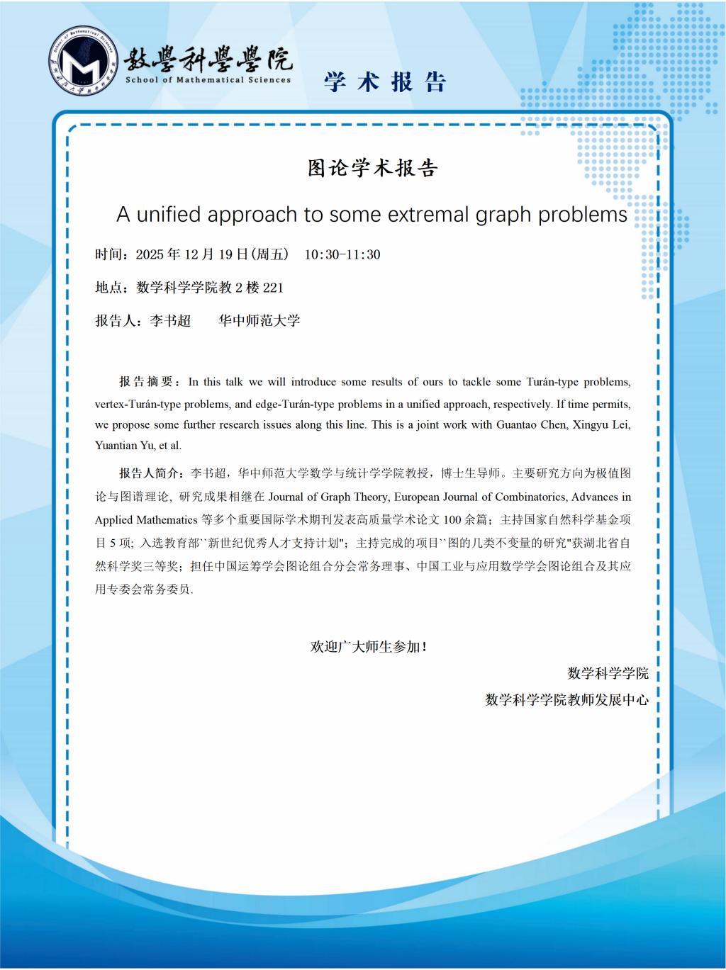 【数苑讲坛】第二十一讲:A unified approach to some extremal graph problems