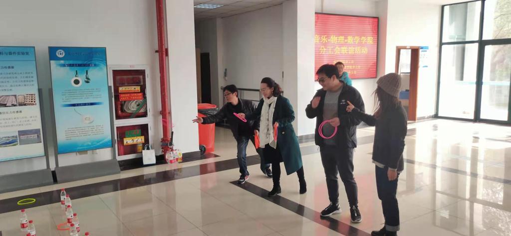 为了丰富教职工的业余文化生活,培养体育锻炼习惯,增强身心健康,营造院区温馨和谐气氛。2020年12月12日下午,我院与音乐学院以及物理学院在逸夫楼举办了三院分工会联谊活动。活动内容为踢毽子和套圈。