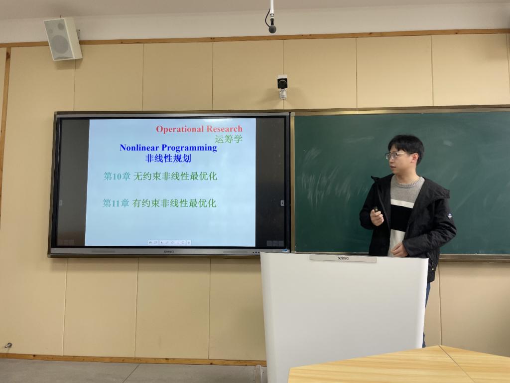 活动中,付文豪老师以《运筹学》课程中的“非线性规划”为主题进行了教学展示。付老师从已学内容出发,通过“面积规划问题”等实际案例,阐释了非线性规划优化的基本概念,并梳理了其与线性规划、整数规划的异同。课堂教学紧密结合理论与实践,既注重拓展学生的知识体系,也着力培养其数学思维能力,使学生能够在已有知识框架的基础上理解和应用非线性规划方法。此外,付老师详细分析了无约束优化问题解的必要条件与充分条件,并结合实际案例深入探讨了其含义,进一步增强了教学内容的吸引力与针对性。