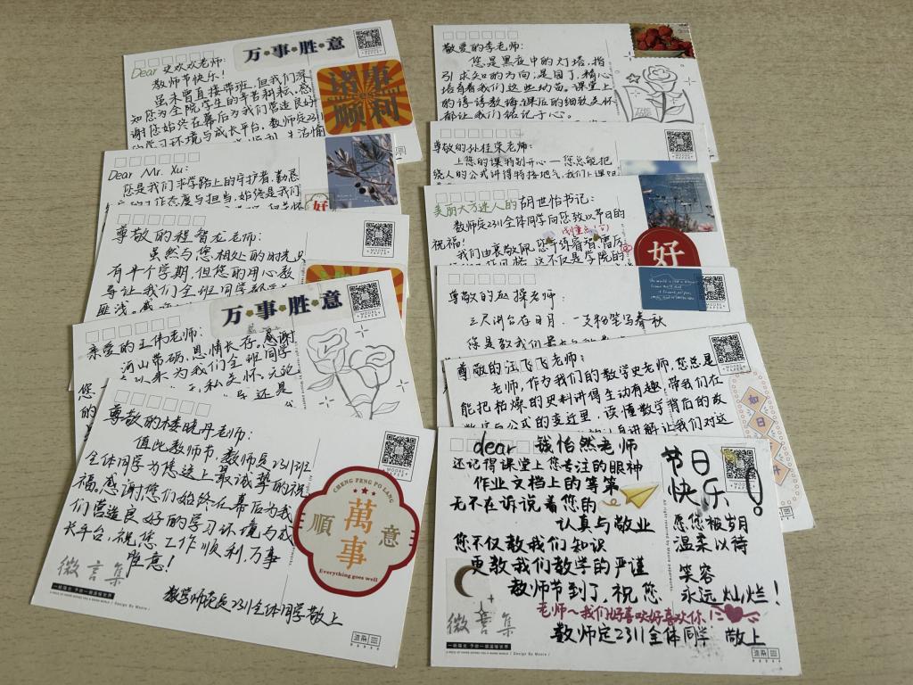 献上“节日的问候”,传递节日温情。9月10日当天,同学们以笔墨书敬意、敬师恩,利用课余时间为老师们送上教师节祝福和礼物,一张张明信片,成为他们向老师表达敬意与祝福的温暖载体。