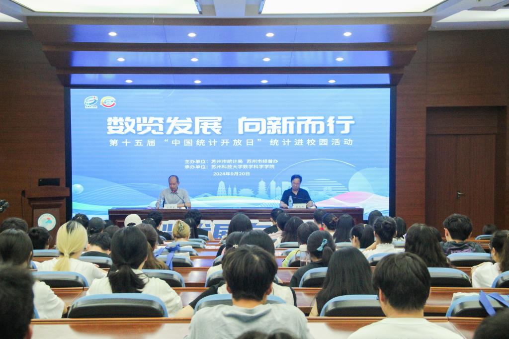 活动现场,气氛热烈而活跃。苏州市统计局精心准备了一场题为《数说苏州75年经济社会发展成就》的专题讲座,通过详实的数据与生动的案例,为在座的近120名师生勾勒出了一幅苏州经济社会发展的宏伟蓝图。讲座内容深入浅出,既展现了统计学的严谨与魅力,又让同学们深刻感受到了苏州这座古城在新时代背景下的蓬勃生机与活力。