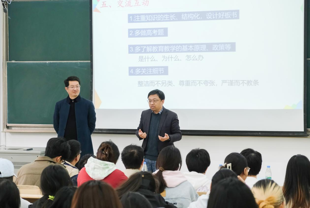 讲座伊始,陈老师围绕新课标中结构化教学的论述展开。他指出,结构化教学能够帮助学生搭建系统的知识框架,提升学习效率。为了让同学们有更直观的理解,陈老师以初中数学新教材中 “用二元一次方程解决问题”的典型内容为案例,深入剖析如何在教学设计中落实结构化教学。他强调,要通过层层递进的教学设计,帮助学生建立完整的知识体系。最后,围绕同学们在招聘过程中笔试、试教、面试环节的关注热点,指出现阶段要扎实掌握专业知识,尝试精心设计教学流程;面试中要注意语言表达、教态仪表,结合教育教学理论,展示自己独特的教学理念和教育情怀。现场陈老师和同学们进行了热烈互动。